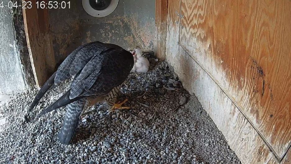 Do tej pory ptasia para odchowała 13 pisklaków. W tym roku Werwa złożyła cztery jaja, a pierwszy z pisklaków wykluł się w sobotę, natomiast ostatni - we wtorek. Życie sokołów i ich pociech można na bieżąco obserwować za pomocą kamer zainstalowanych w budce.