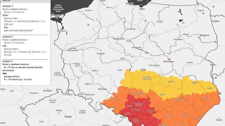 Instytut Meteorologii i Gospodarki Wodnej (IMGW) ogłosił alerty trzeciego stopnia przed burzami dla zachodniej części województwa małopolskiego i województwa śląskiego, z wyjątkiem jego północnej części. Prognozowane są burze z ulewnymi opadami deszczu, które mogą osiągnąć nawet 70 mm, oraz porywy wiatru do 70 km/h. Lokalnie może wystąpić grad. Ostrzeżenia obowiązują od czwartku od godz. 13 do 1 w nocy w piątek. Intensywne opady deszczu mogą prowadzić do podtopień.