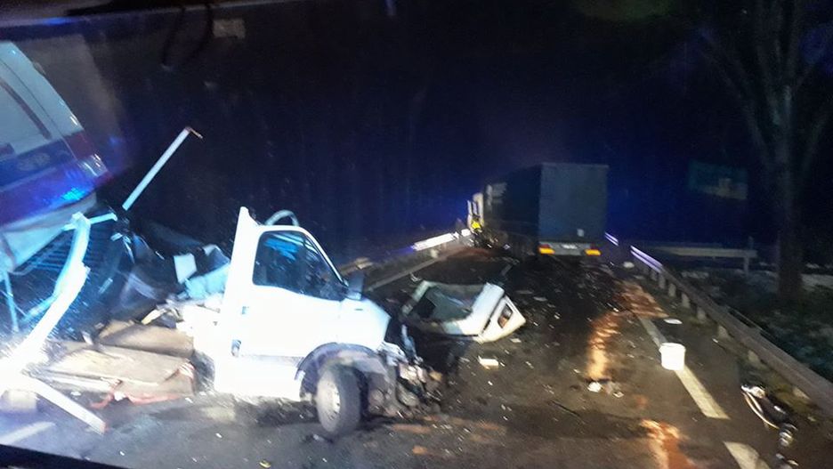 Kierowca samochodu dostawczego wyprzedzał inne auto, bez upewnienia się, że nic nie nadjeżdża z przeciwka. Po czołowym zderzeniu z tirem, bus został całkowicie rozbity.