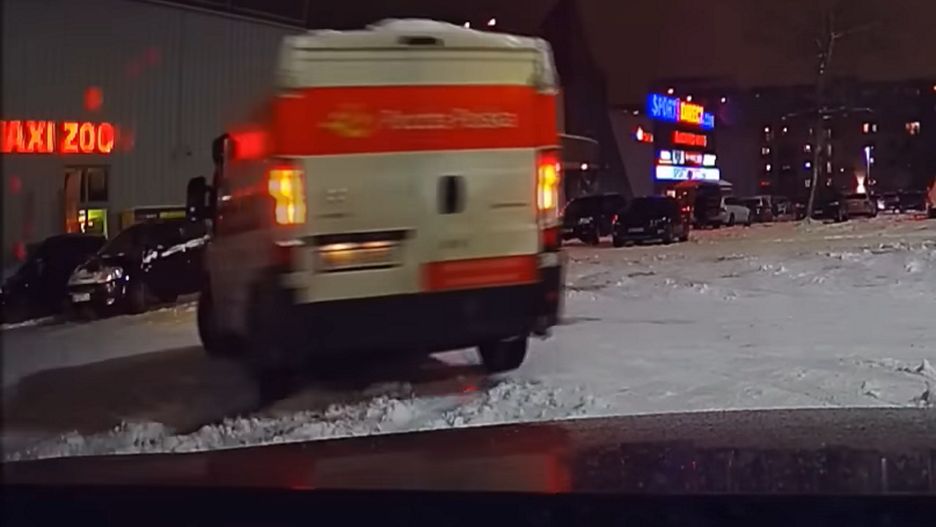 Przed zaparkowanym autem nagrywającego pojawiła się furgonetka Poczty Polskiej. Nie wzbudziłoby to większego zainteresowania, jednak zasiadający za kierownicą kurier okazał się miłośnikiem driftu. Pracownikowi nie przeszkadzały gabaryty auta, dlatego wpadł w kontrolowany poślizg na terenie zaśnieżonego parkingu pod centrum handlowym. Szalony manewr został powtórzony kilka razy. Na szczęście wszystko skończyło się szczęśliwie.
