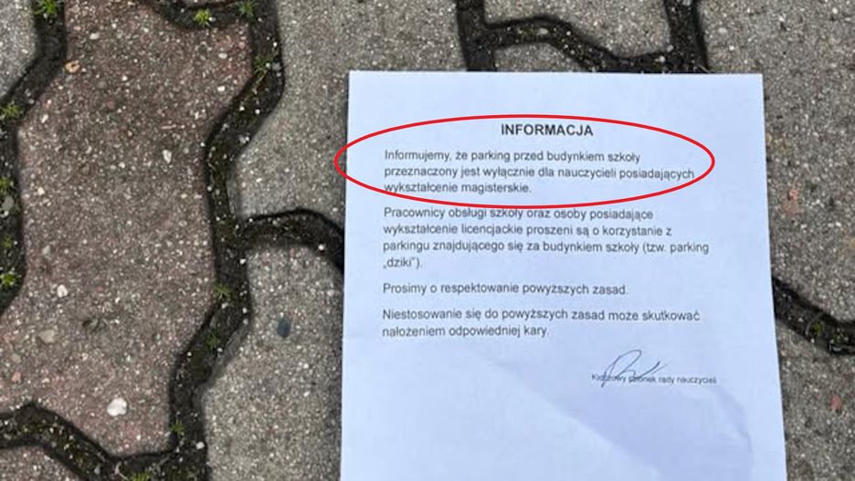 Autor tekstu poinformował, że parking przed szkołą jest przeznaczony "wyłącznie dla nauczycieli posiadających wykształcenie magisterskie". Pozostali pracownicy obsługi oraz osoby z "zaledwie" tytułem licencjata zostali pouczeni, by korzystać z tzw. "dzikiego parkingu" za budynkiem szkoły. Na koniec pogrożono "nałożeniem odpowiedniej kary" za nieprzestrzeganie tych zasad.