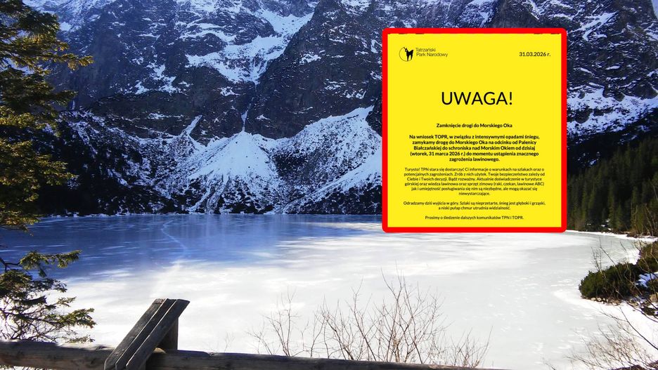 Na wniosek TOPR, Tatrzański Park Narodowy zdecydował o zamknięciu drogi prowadzącej do Morskiego Oka na odcinku od Palenicy Białczańskiej aż do schroniska. Ograniczenie obowiązuje od wtorku, 31 marca 2026 roku i pozostanie w mocy do momentu ustąpienia znacznego zagrożenia lawinowego.