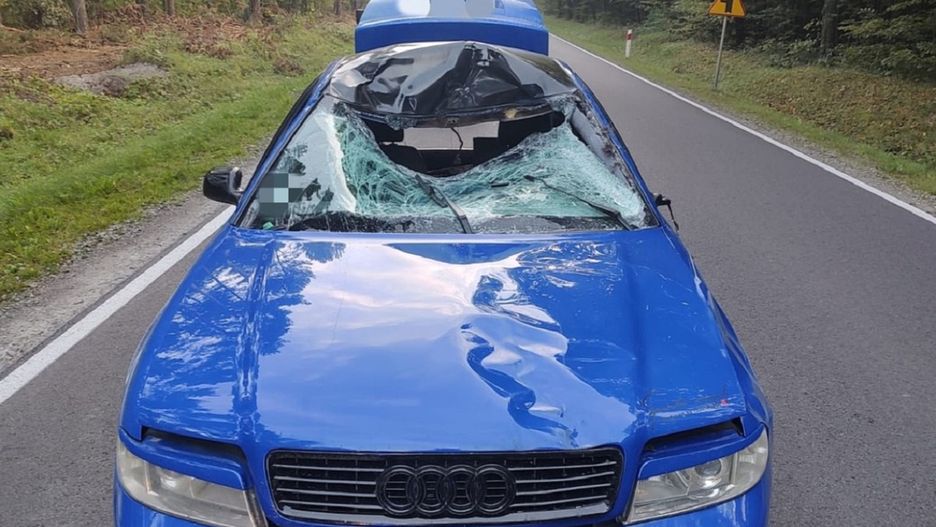 Nagle z lasu wybiegł sporych rozmiarów łoś. Kierowca nie miał czasu zareagować, zwierzę wpadło prosto pod koła rozpędzonego pojazdu. Następnie na skutek ogromnej siły odbiło się od auta. "Uszkodzeniu uległa pokrywa silnika, szyba przednia samochodu oraz dach" - podała asp. Anna Hanus - Witko, oficer prasowy komendy policji w Lubaczowie. Policja pokazała zdjęcie zdewastowanego pojazdu.