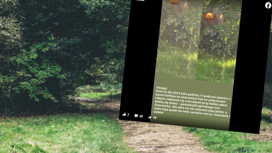 Uwaga! Dnia 22.08.2023 koło godziny 11, podczas spaceru z psem trafiłam na zboczeńca! Pan na załączonym zdjęciu zabawiał się w krzakach przy boisku, bawią się dzieci— gwarków/Krupińskiego, tzw. Czerwonka. Nie dało się nie usłyszeć jego jęków, a mało tego — gadał do mnie sprośne rzeczy. Uważajcie na siebie! — napisała zbulwersowana spacerowiczka.
