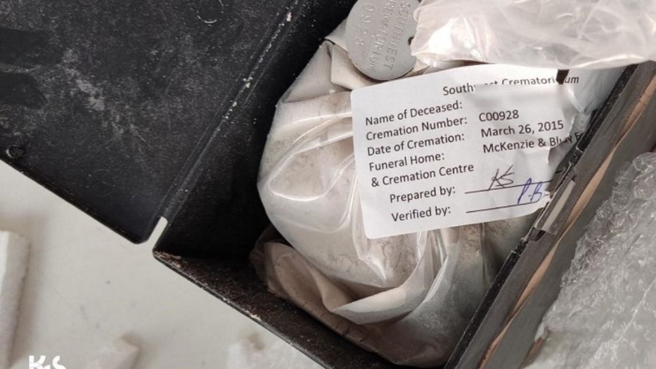 W paczce znajdowała się plastikowa puszka z informacją z imieniem i nazwiskiem zmarłego, dacie i numerze kremacji oraz nazwie domu pogrzebowego. Wewnątrz puszki znajdował się worek foliowy z szarym proszkiem.
