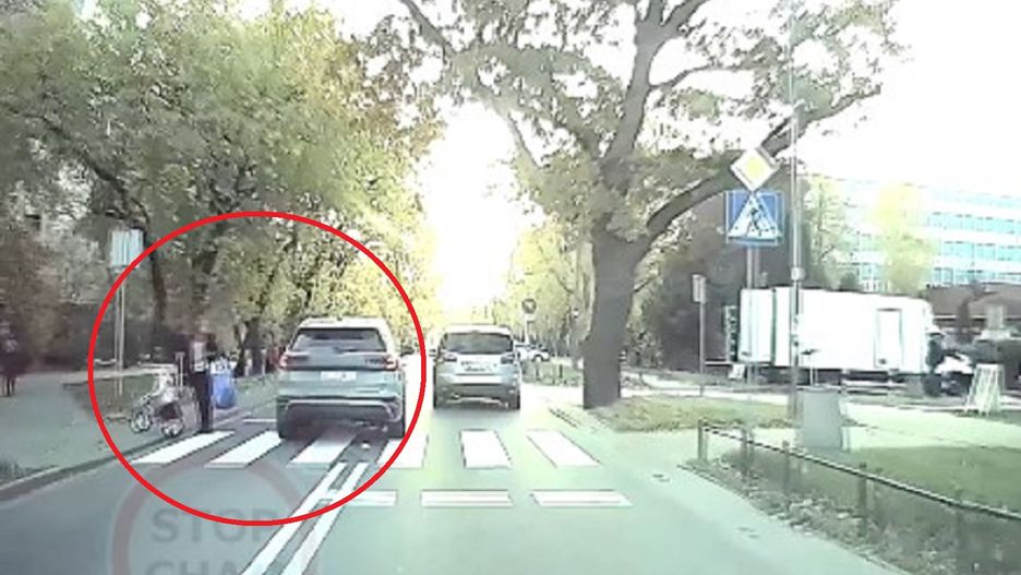 Przejściem dla pieszych nie przejmował się natomiast inny z uczestników ruchu drogowego. Kierujący SUV-em postanowił wyprzedzić stojące auto przed pasami. Jego zachowanie było o tyle groźne, że milimetry dzieliły pojazd od przechodzącej dwójki. Strach pomyśleć, co by mogło się stać, gdyby rozpędzone auto wpadło w matkę z dzieckiem.