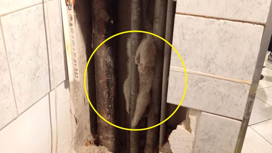Ostatecznie strażacy byli zmuszeni rozkuć ścianę. Za warstwą cegieł ich oczom ukazał się przykry widok. Pomiędzy rurami instalacyjnymi a ścianą kanału utknął kot. Zwierzę znalazło się w szczególnie niefortunnej sytuacji, gdyż zaklinowało się w pozycji pionowej, z głową skierowaną w dół.