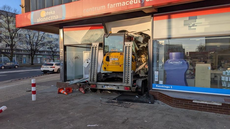 Minikoparka wjechała w aptekę. Groźne zdarzenie w centrum Szczecina