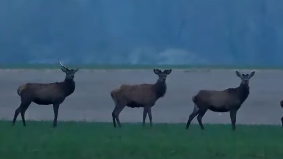 Widać na nim chmarę jeleni. Kilkanaście dostojnych zwierząt przemierza okoliczne pola, zwracając co jakiś czas uwagę na nagrywającego. Nagranie zostało wykonane w środę (23 kwietnia) w godzinach porannych.