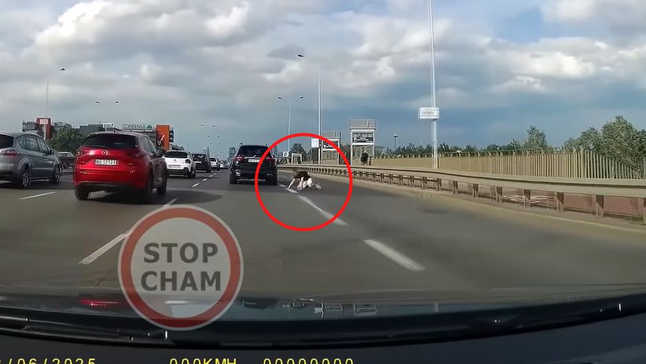 To mogło zakończyć się tragicznie. Kamera samochodowa uchwyciła mężczyznę, który przeskoczył przez barierkę i wbiegł na jezdnię. Po chwili runął na ziemię - potknął się praktycznie chwilę po wtargnięciu na drogę.