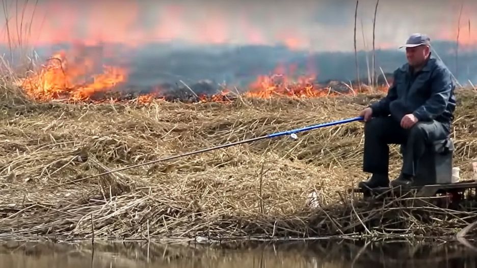 Chodzący codziennie na ryby emeryt z Białorusi nawet nie wie, jak sławny się zrobił w ostatnich kilku dniach. Wszystko za sprawą filmiku, na którym widać łowiącego ryby mężczyznę, który jak gdyby nigdy nic oddaje się swojej pasji, gdy w tle buchają płomienie.