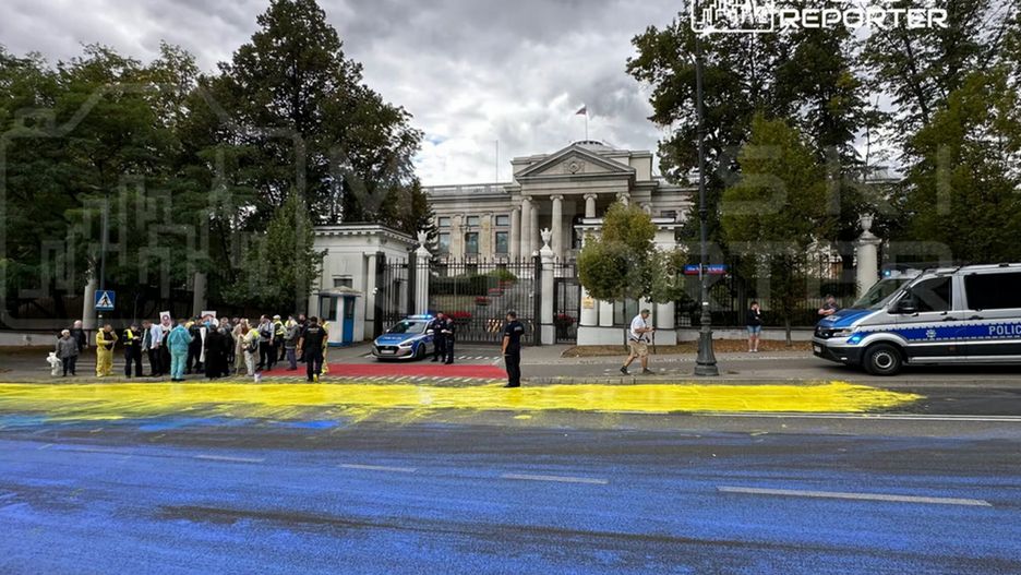 Namalowali flagę Ukrainy przed ambasadą Rosji w Warszawie