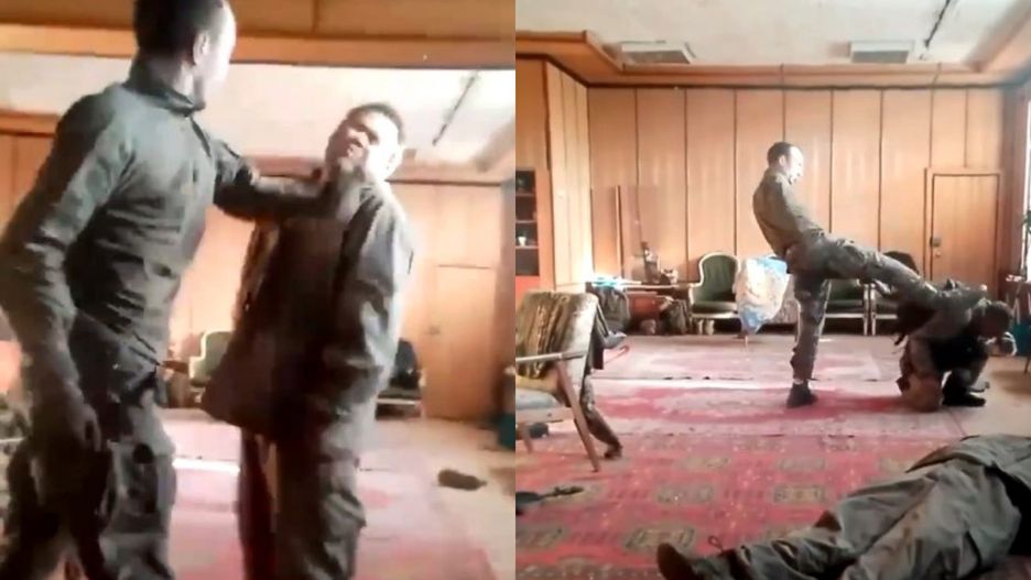 Po kilkunastu sekundach, gdy pierwszy żołnierz leży nieruchomo, dowódca bierze się za kolejnego. - Nie jesteś człowiekiem - mówi do niego. Po chwili czterokrotnie uderza mężczyznę w twarz. Gdy ten upada, kopie go w głowę.