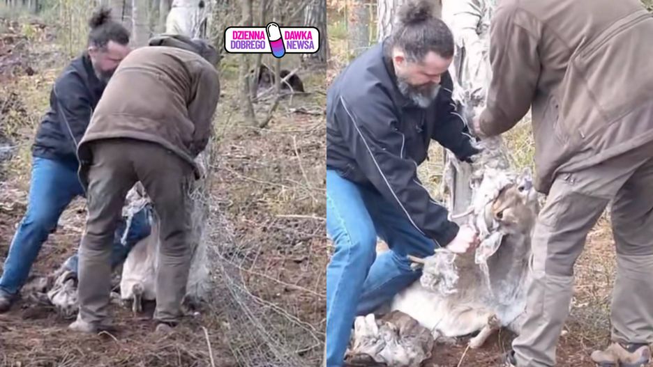 Wpis opublikowany przez Nadleśnictwo Goleniów dokumentuje zdarzenie, do którego doszło w szkółce leśnej w Krępsku. Na nagraniu widać dwóch pracowników leśnych, którzy próbują uwolnić młodego daniela zaplątanego w metalową siatkę.