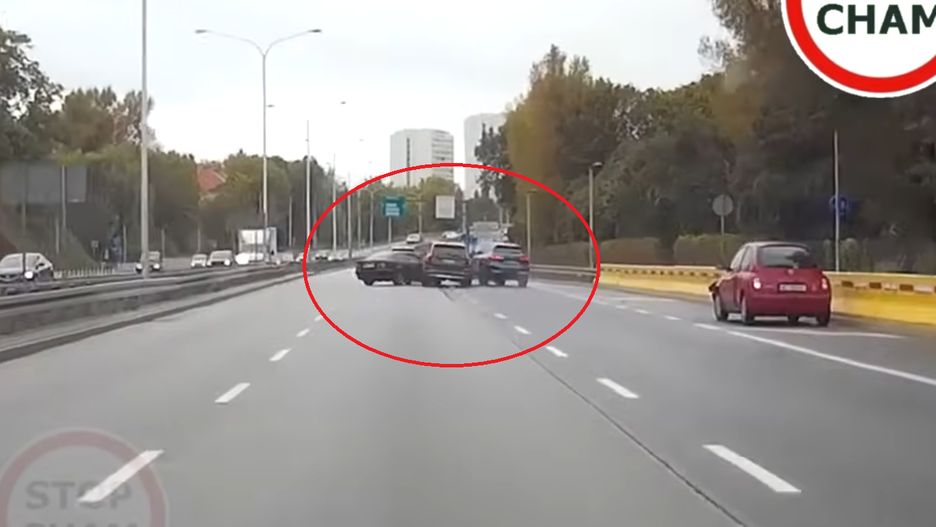 Film, na którym widzimy całe zdarzenie, pojawił się na kanale "Stop Cham" w serwisie YouTube. Na nagraniu widzimy, jak kierowca mercedesa traci przyczepność na łuku drogi, uderza w volvo, które z kolej wpada na bmw. Lekki deszczyk sprawił, że jezdnia w tym miejscu była mokra.