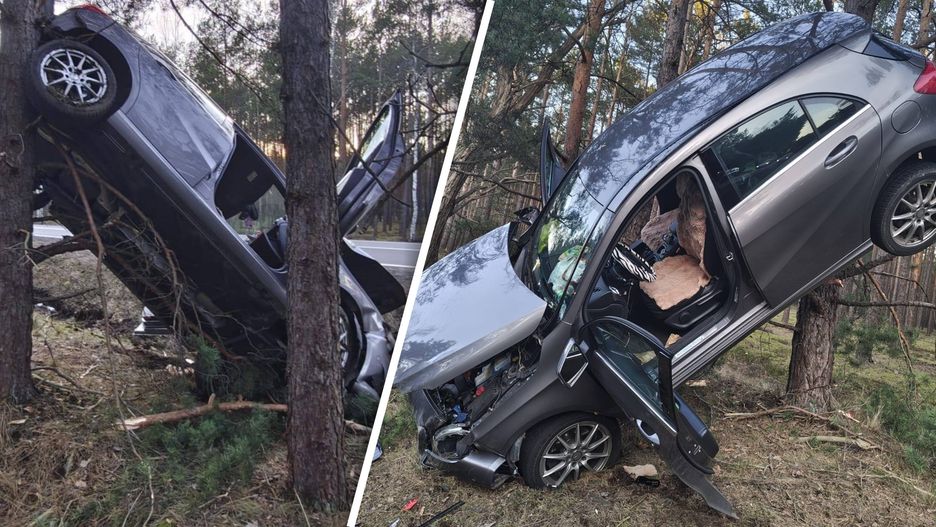 Gwałtowny manewr sprawił, że auto uderzyło o drzewo i... praktycznie na nim zawisło.