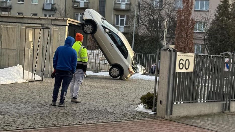 Niecodzienna sytuacja podczas serwisowania windy parkingowej w Krakowie. Samochód zaparkował w miejscu, w którym znajduje się dźwig parkingu podziemnego. W trakcie dokonywania testów, winda podniosła przód auta. Osobowy pojazd stanął w pionie. Konieczna była interwencja służb.