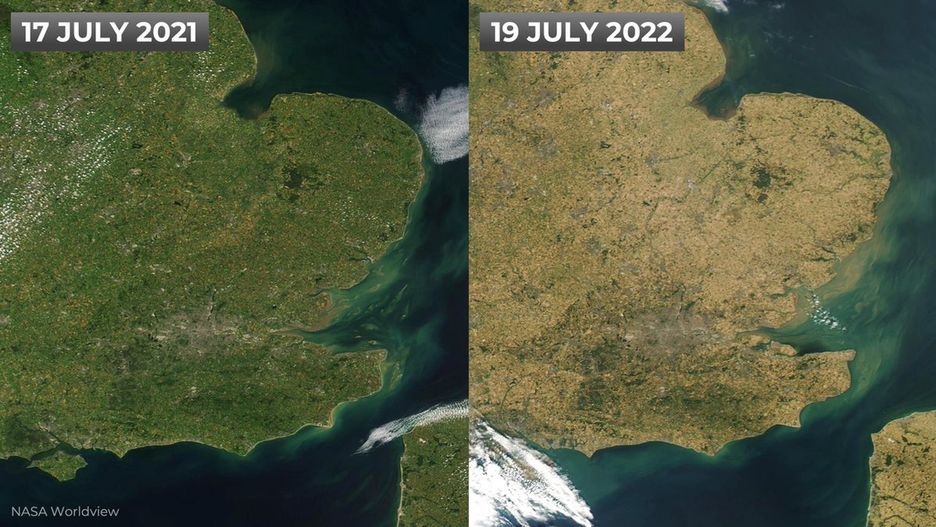 Po lewej możemy dostrzec Wielką Brytanię w większości w kolorze zielonym, podczas gdy zdjęcie po prawej przedstawia kraj w żółtych barwach. Wynika to z faktu, że fala upałów doprowadziła do wysuszenia gleby i roślin.