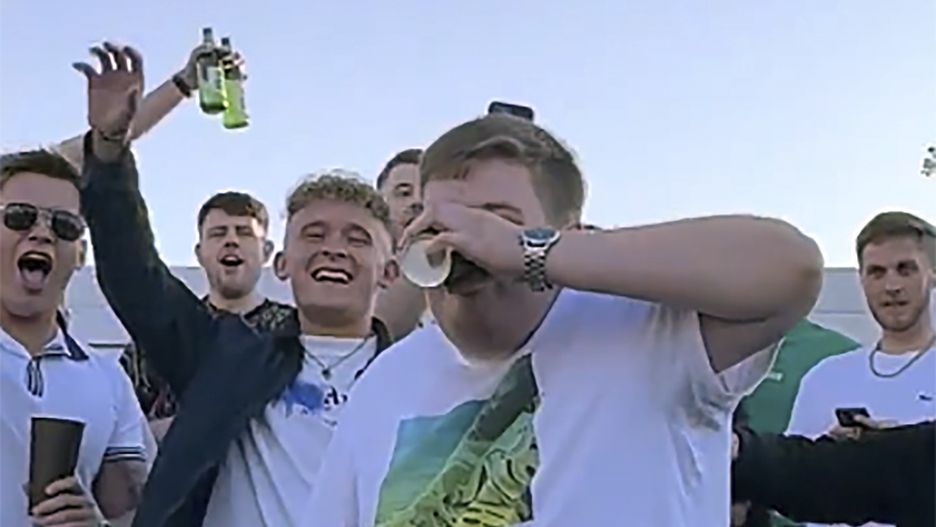 Na filmie widać, jak mężczyzna z trudem przełyka ostatnie krople piwa. Po chwili zatacza się i upada głową w dół, prosto pomiędzy krzesełka. Wciąż trzyma jednak w ręku swój kubek. Zebrani wokół fani zaczynają wesoło rechotać.