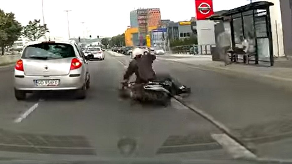Nagle motocyklista pomylił hamulce, stracił równowagę i przewrócił się. Niestety zrobił to na tyle nieumiejętnie, że upadł, blokując część jednego z pasów ruchu. Na szczęście jadący z wideorejestratorem kierowca błyskawicznie zareagował i cudem ominął leżącego. Pomimo szybkiej reakcji zderzak jego samochodu uderzył jednak w kierującego skuterem.