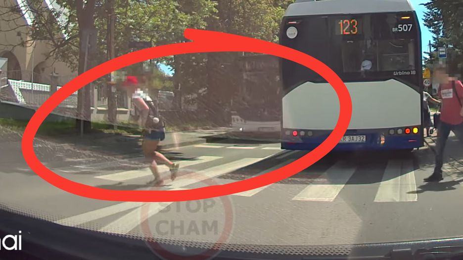 Jednak widząc, że z drugiej strony jedzie autobus miejski, kobieta... przyśpiesza. Zamiast zatrzymać się wchodzi bezpośrednio przed maskę. Kierowca nie ma żadnych szans zatrzymać w tym momencie pojazd.