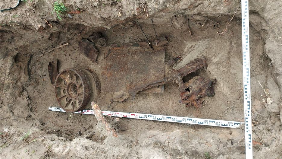 Już na głębokości mniej więcej metra poszukiwacze natrafili na cenne artefakty. Rzeczywiście były to szczątki zniszczonego radzieckiego czołgu T-34. Z ziemi wykopano m.in. koło czołgowe, karabin, amunicję pancerną, łuski, a także część silnika.