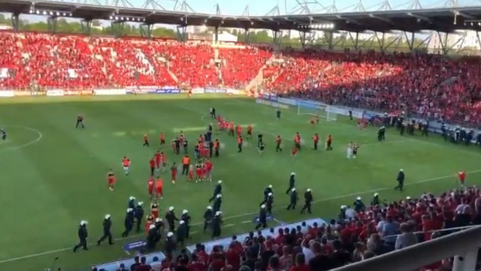 Na tym się jednak nie skończyło. Kilka chwil później, kibice wtargnęli na murawę i zaczęli szarpać się z zawodnikami klubu. Jeden z nich gonił 18-letniego Roberta Prochownika, którego zmusił do oddania koszulki zespołu. Kiedy młody gracz to uczynił, chuligan uderzył go w twarz. Interweniować musiała policja, która użyła dwóch armatek wodnych oraz gazu łzawiącego.