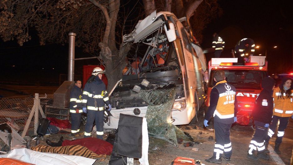 Autokar pełny ludzi wbił się w drzewa na drodze z Ankary do miasta Bursa. Wypadek miał miejsce w sobotni poranek w prowincji Eskisehir. Według państwowej agencji prasowej Anadolu, kierowca przyznał, że gwałtownie skręcił próbując ominąć na drodze bezpańskiego psa. Zwierzę przeżyło, ale zginęło 11 osób, a 46 zostało rannych. Ze względu na ich liczbę ofiary wypadku rozwieziono do trzech różnych szpitali.
