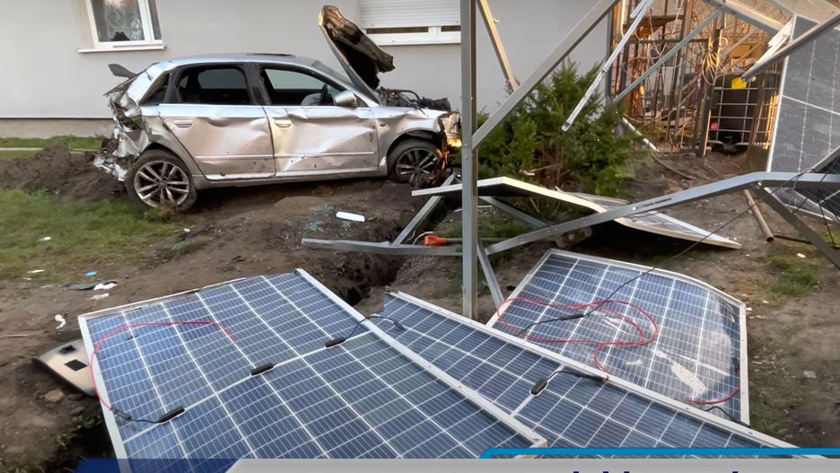 Auto przeleciało nad ogrodzeniem. Uderzyło w instalację fotowoltaiczną, po czym koziołkowało przed prywatnym domem.