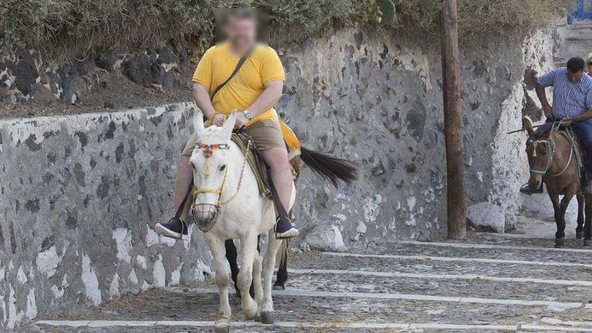 Osiołki pracujące na greckiej wyspie Santorini nie dają sobie rady z otyłymi turystami - alarmują organizacje na rzecz praw zwierząt. Osły niejednokrotnie muszą dzwigać na swoich grzbietach monstrualnie otyłych pasażerów. Dodatkowo robią to w bardzo trudnym terenie.