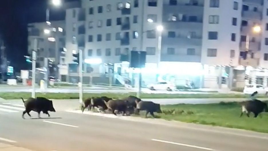 Na opublikowanym wideo widzimy spacerującą miejskimi ulicami liczną rodzinę dzików. Pomiędzy dorosłymi osobnikami biegną także młode.