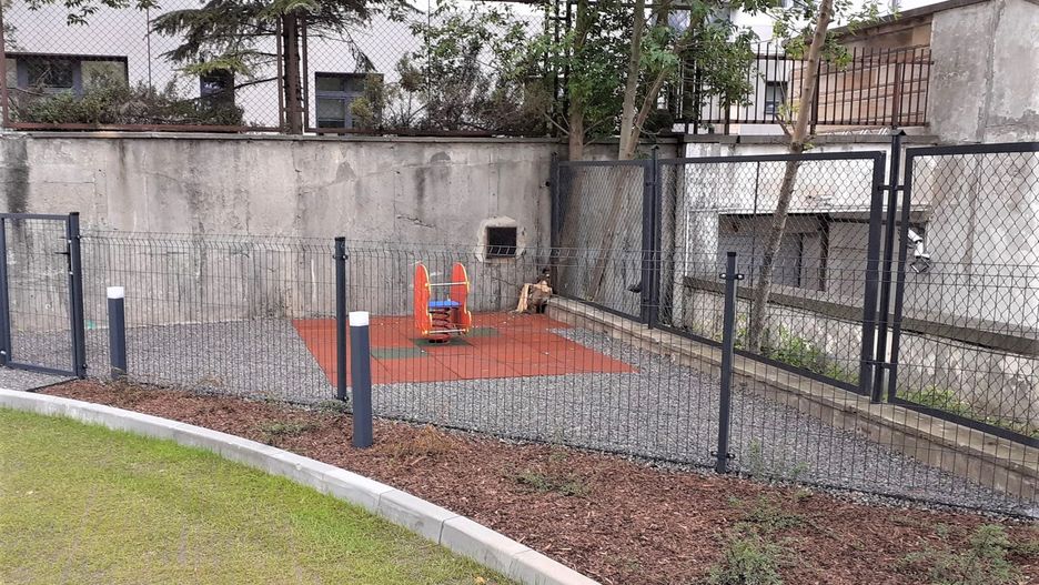 Na zdjęciach widzimy bardzo małych rozmiarów, ogrodzony "plac zabaw", na którym znajduje się tylko jedna mała huśtawka.