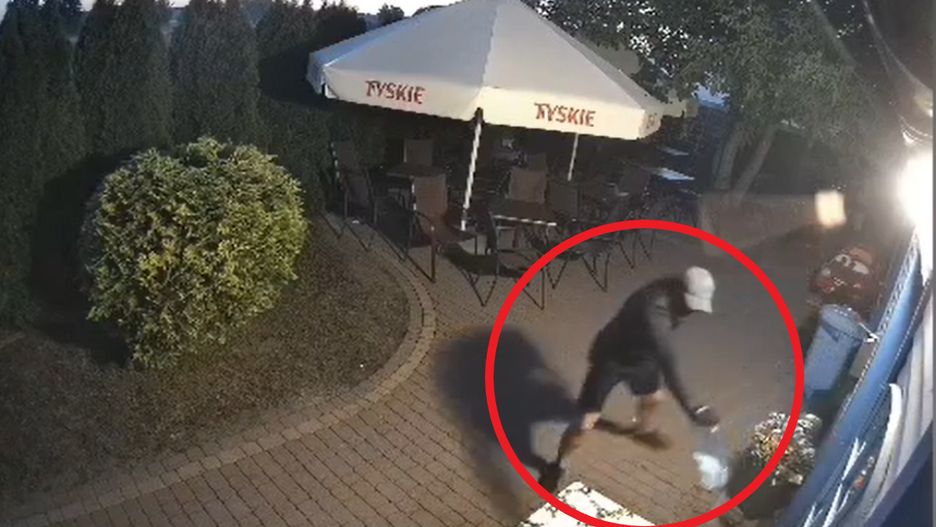 Na filmie widzimy samochód, który podjeżdża pod bar. Po chwili zjawia się mężczyzna w ciemnej bluzie i czapce z daszkiem. Otwiera furtkę, wchodzi do środka, rozlewa ciecz z butelki wzdłuż budynku, a potem podpala. Na nagraniu widać też buchające płomienie...