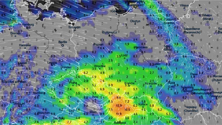 W pasie od południowej części Dolnego Śląska przez Opolszczyznę, Śląsk i Małopolskę po Świętokrzyskie, Podkarpacie i południową Lubelszczyznę spadnie od 5 do 15 litrów wody na każdy metr kwadratowy powierzchni.