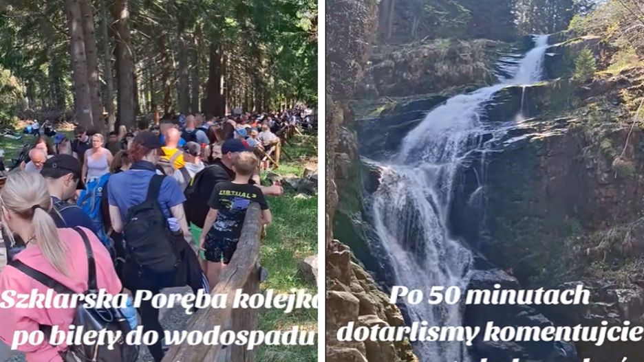 Wydaje się, że 2 maja niemal wszyscy turyści, którzy przyjechali w Karkonosze, obrali sobie jeden cel - Wodospad Kamieńczyka (położony na trasie ze Szklarskiej Poręby na grzbiet główny Karkonoszy). Na nagraniu, które pojawiło się na TikToku widać gigantyczne tłumy oczekujące w kolejce po bilet. Jak poinformował później autor nagrania, do atrakcji udało się dotrzeć po 50 minutach.