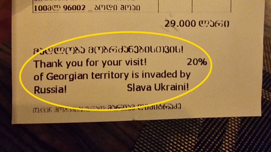 Na dole paragonu widzimy napis w języku angielskim: "Dziękujemy za wizytę! 20 proc. terytorium Gruzji jest okupowane przez Rosję. Chwała Ukrainie!" - czytamy na paragonie.