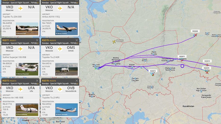 W sumie zaobserwowano 8 nietypowych przelotów rosyjskich sił specjalnych. W serwisie FlightRadar24 można było na żywo śledzić ruchy rosyjskich maszyn: Tu-214PU, Tu-214SR, A319CJ, Tu-204-300, Su 100-95B, Il-96-300PU, An-148-100E. Na rosyjskim niebie pojawiła się także niezidentyfikowana maszyna o numerze 141E16.