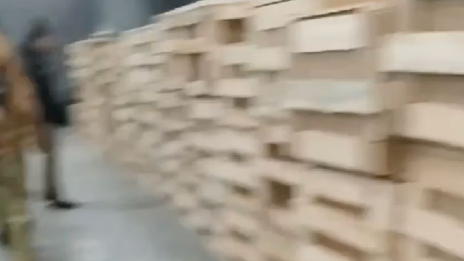 Na nagraniu widać ogromny magazyn, przypominający magazyn przemysłowy. Wejścia pilnują żołnierze. Na filmie widzimy też wojskowych oraz pracowników kostnicy z założonymi białymi roboczymi kombinezonami. Nie ma wśród nich ani jednej kobiety. Na tle innych wyróżnia się mężczyzna w czarnym cywilnym ubraniu, prawdopodobnie będący pracownikiem firmy pogrzebowej.
