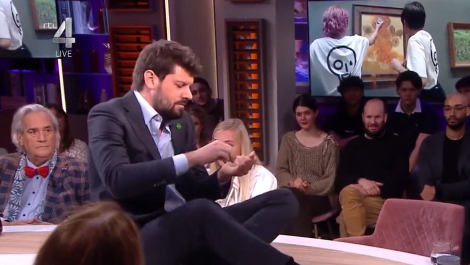 Holenderski działacz na rzecz klimatu przykleił się do stołu podczas występu na żywo w talk-show dziennikarki Evy Jinek. Jelle de Graaf został zaproszony do studia, aby omówić falę protestów, do których dochodziło w muzeach i galeriach sztuki. Miał opowiedzieć o aktywistach, którzy przykleili się do słynnego obrazu Vermeera Dziewczyna z perłą.