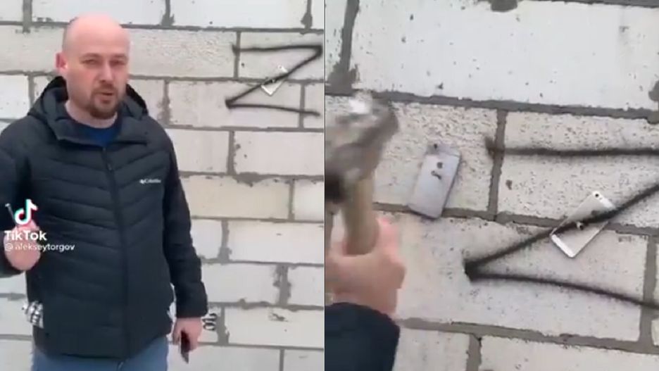 Władimir Putin jest moim prezydentem i to jest moja odpowiedź na sankcje! - powiedział Rosjanin i rozbił młotkiem swojego iPhone'a. Zrobił to w symbolicznym dla siebie miejscu, na ścianie z literką Z, która jest jednym z symboli wojennych Federacji Rosyjskiej.