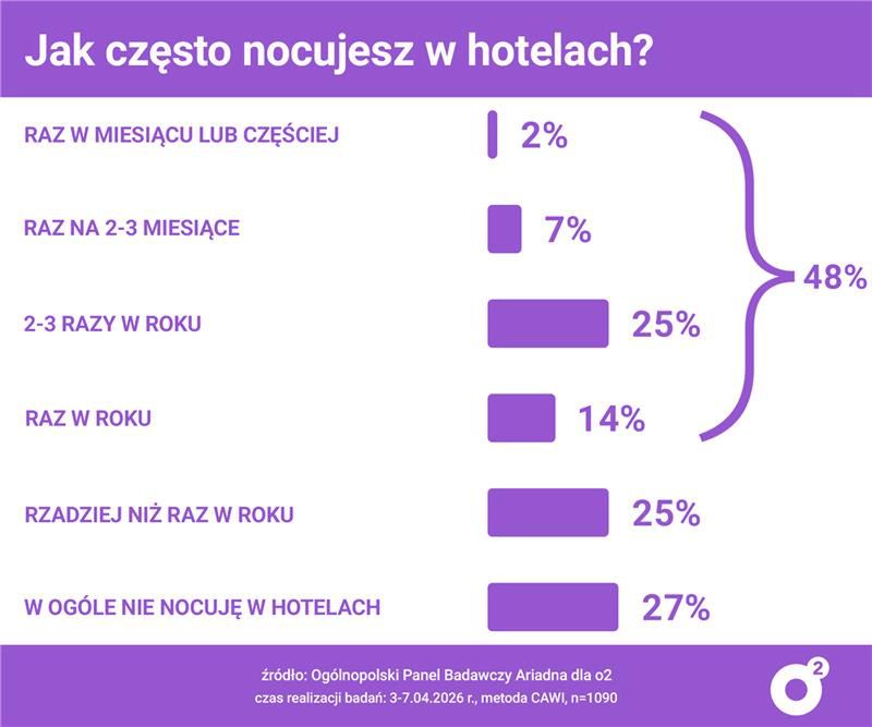 W badaniu wykazano też, jak często respondenci korzystają z hoteli. 48 proc. deklaruje, że nocuje w nich przynajmniej raz w roku - najczęściej 2–3 razy rocznie (25 proc.) lub raz w roku (14 proc.). Rzadziej niż raz w roku nocuje 25 proc. badanych, a 27 proc. w ogóle nie korzysta z hoteli.