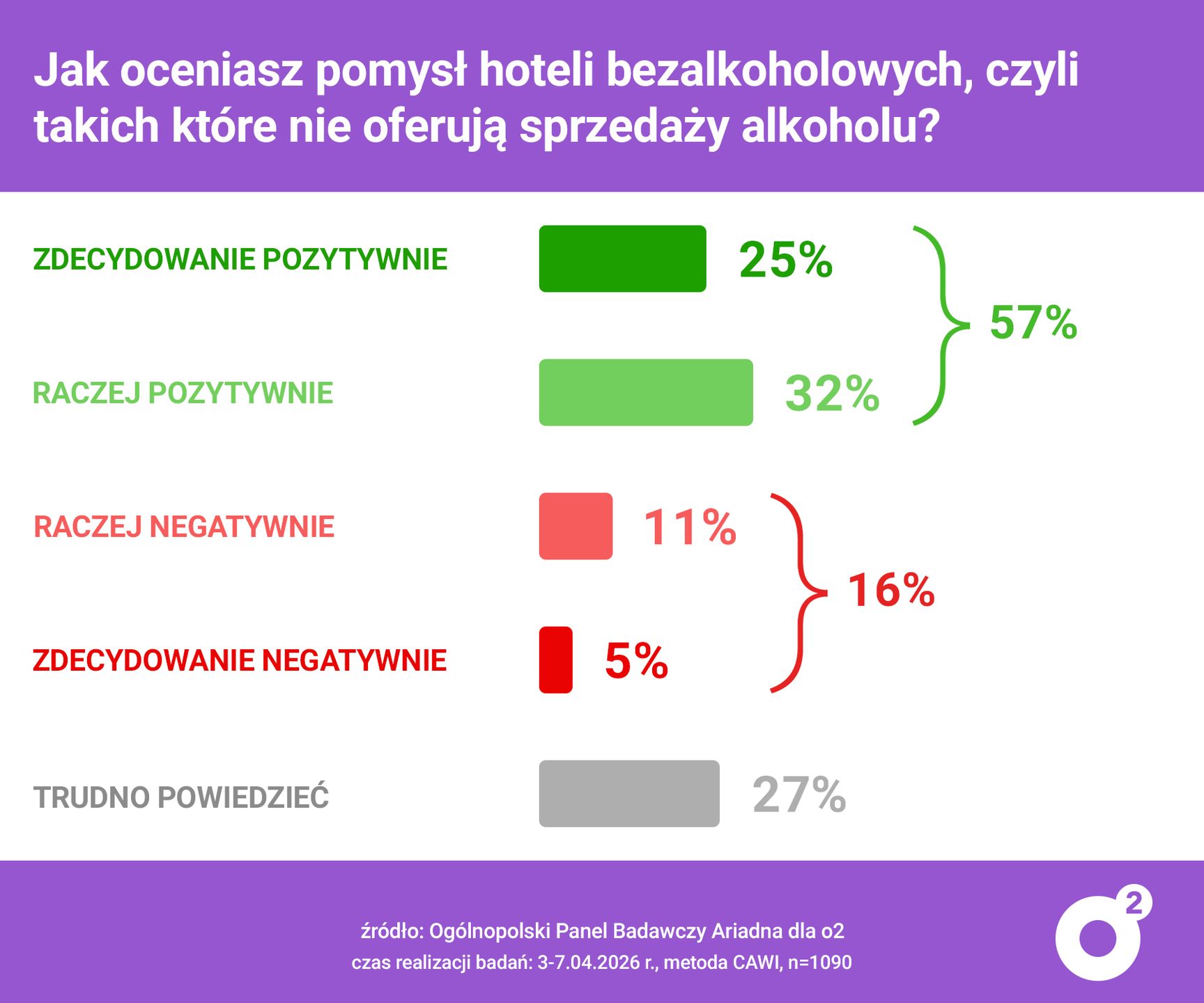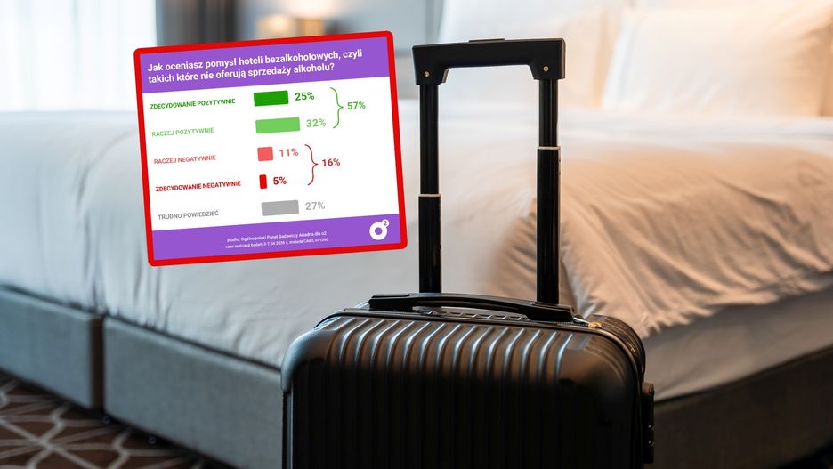 Z badania panelu Ariadna wynika, że pomysł hoteli bez alkoholu spotyka się z wyraźnie pozytywnym odbiorem. Łącznie 57 proc. respondentów ocenia go dobrze – 25 proc. "zdecydowanie pozytywnie", a 32 proc. "raczej pozytywnie". Przeciwnego zdania jest 16 proc. badanych, w tym 11 proc. "raczej negatywnie" i 5 proc. "zdecydowanie negatywnie". Jednocześnie 27 proc. ankietowanych nie ma w tej sprawie wyrobionej opinii.