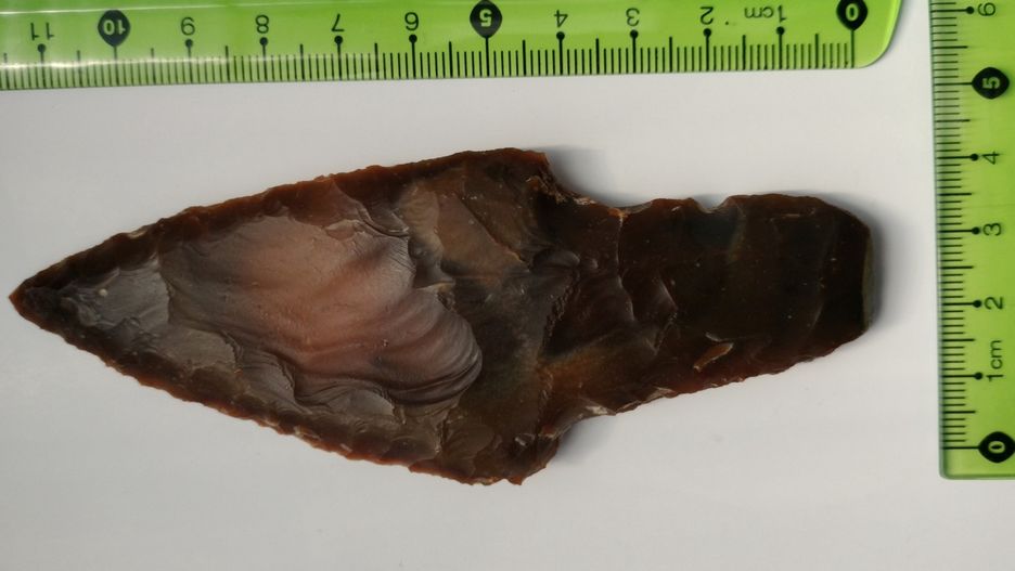 Drugie znalezisko to w całości zachowany krzemienny grot do oszczepu lub włóczni z wyraźnie zaakcentowanym trzonkiem, który był umieszczany w długim drzewcu tej broni. Grot wykonany został z krzemienia czekoladowego, jak sama nazwa wskazuje, o barwie brązowej.
