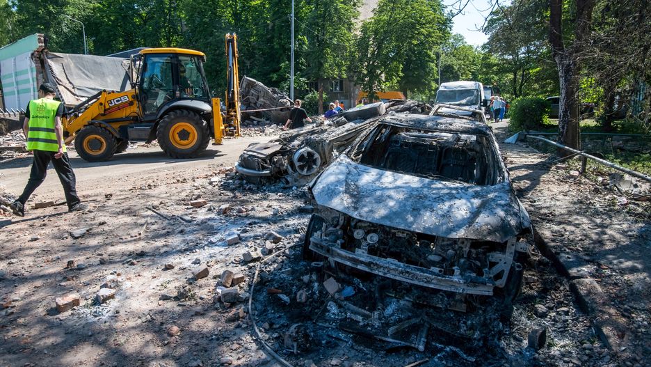W dzielnicy Swiatoszynskiej trafiony został 14-piętrowy budynek mieszkalny, co doprowadziło do pożaru. Rosyjski ostrzał uszkodził także infrastrukturę kolejową, co dodatkowo utrudnia sytuację w mieście.