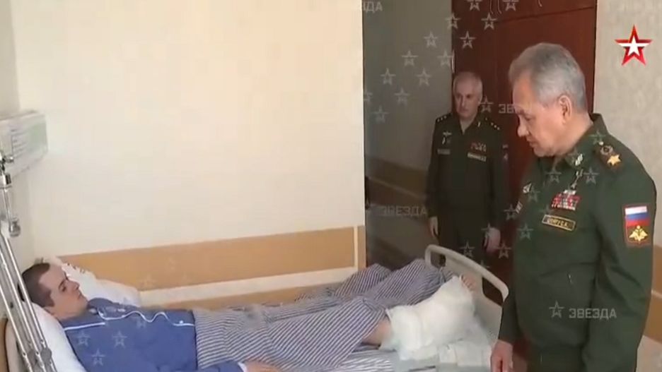 Leżący na łóżku mężczyzna miał gips na prawej nodze, a obok stały kule ortopedyczne. Szojgu rozmawiał z rannym, jednak tym razem obeszło się bez uścisków i zaszczytów. Ranny nie dostał orderu, a jedynie pozdrowienia od ministra.