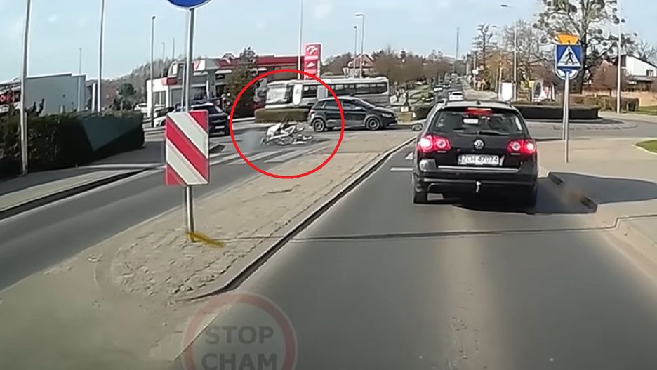 Już w pierwszych ujęciach (...) widać, że najprawdopodobniej próbuje wybrać numer do kogoś. Gdy rozpędził się z górki, jechał pod prąd i aby uniknąć uderzenia w samochód, zahamował tak gwałtownie, że przeleciał przez kierownicę - brzmi opis do wideo zamieszczonym w "STOP CHAM".
