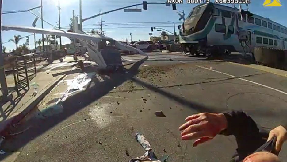 Na filmiku widać jak policjanci spieszą się, aby wyciągnąć z samolotu rannego mężczyznę. Kiedy to się udaje, odciągają go pospiesznie od torów. Kilka sekund później w rozbity samolot wjeżdża rozpędzony pociąg. Na szczęście nikomu nic się nie stało.