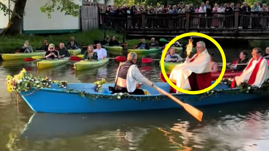Na nagraniu uwieczniono zarówno księdza, który wsiadł do łódki z monstrancją, jak i wiernych - ludzie płynęli za duchownym.