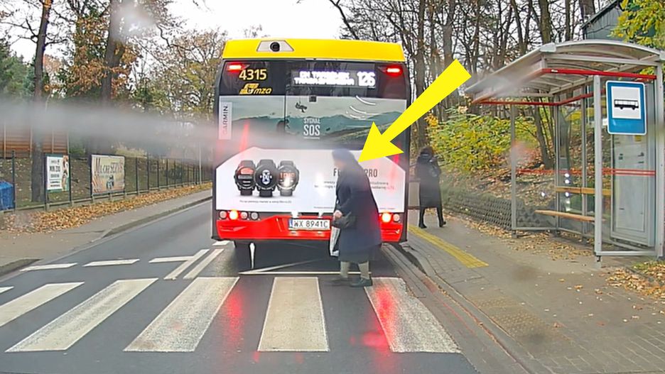 Obok niej znajduje się autobus, który akurat zatrzymał się na przystanku. Gdy dochodzi do środka jezdni, tuż przed nią przejeżdża auto.