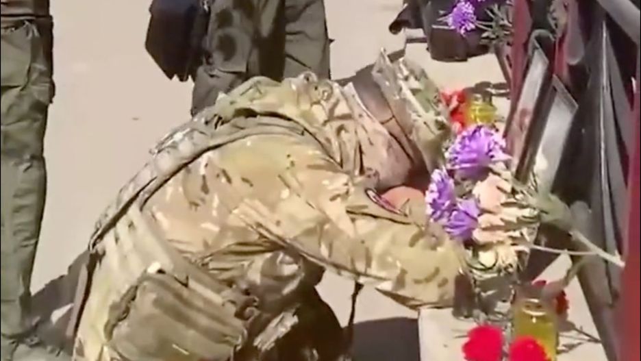 Jeden z nich, będący w mundurze, w pewnym momencie klęka na oba kolana i zaczyna płakać. Mężczyzna pogrążony jest żalu w związku ze śmiercią swoich dowódców.